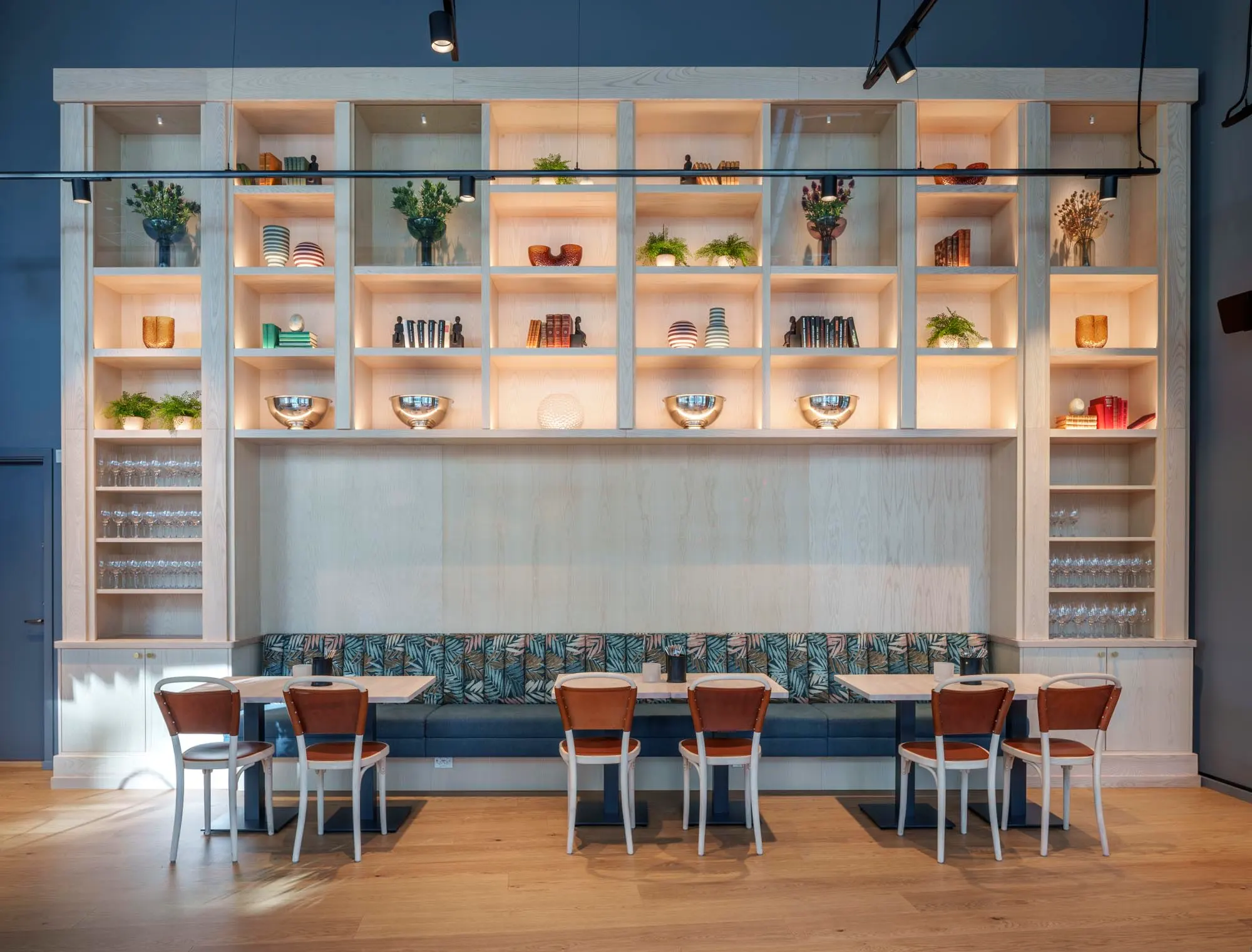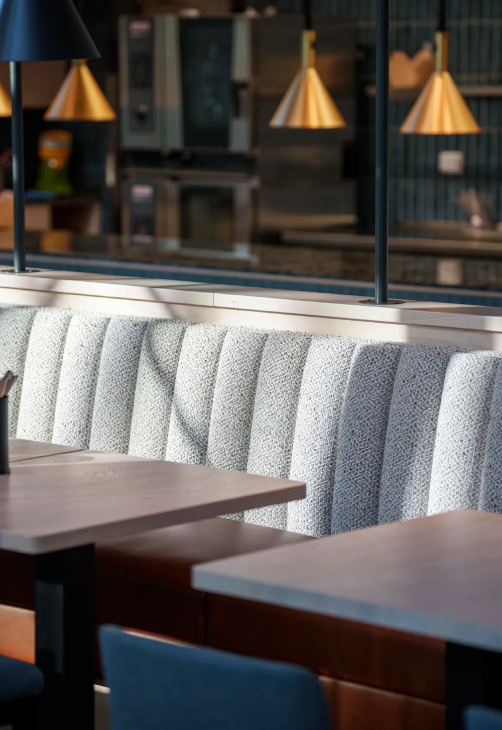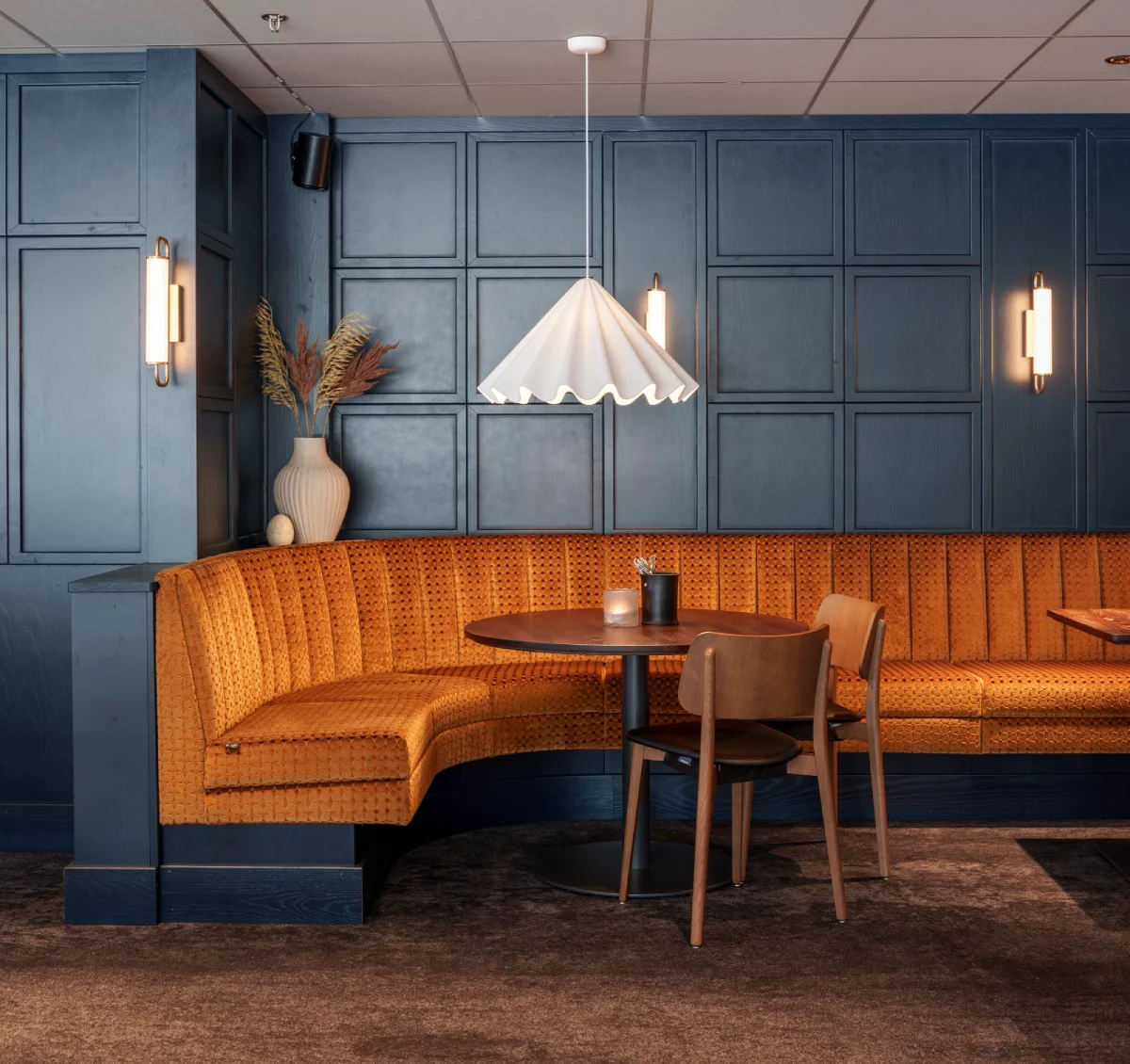 Konceptet vi tog fram är utformat för att hålla över tid, både funktionellt och estetiskt. En specialdesignad akustikvägg bidrar till rumsupplevelsen och skapar en behaglig ljudmiljö. Uppdraget omfattade projektering och ritning samt leverans av köksutrustning, inredning och belysning, där varje del samverkar i ett varierat rumsligt uttryck anpassat för olika typer av vistelse och tempo.