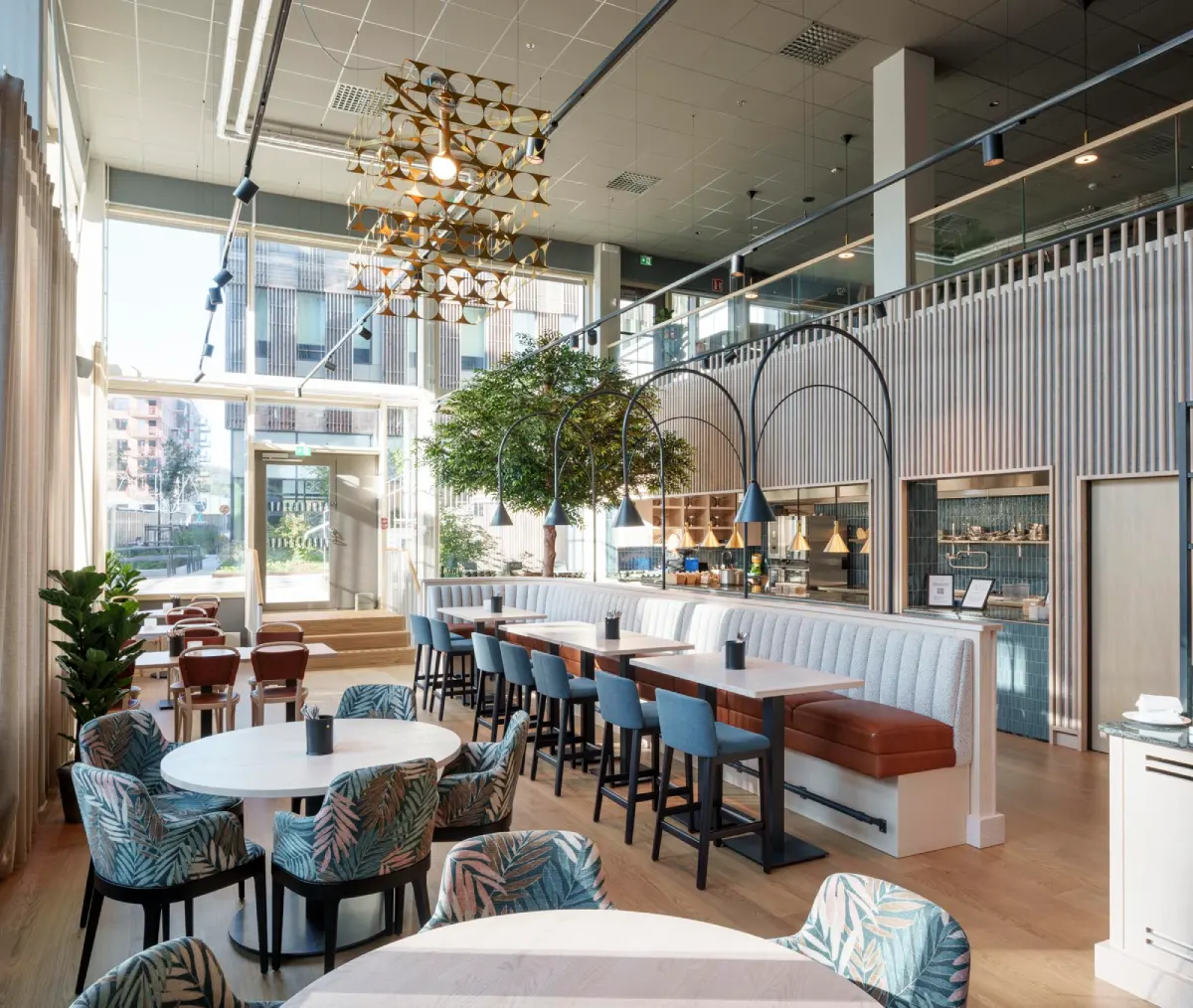 Vi fick äran att utveckla en helhetslösning för restaurang Aura i Mölndal Health Cares nya huvudkontor, beläget i GoCo Health Innovation City. Projektet präglades av ett tydligt fokus på svensk design, långsiktig hållbarhet och återbruk, med medvetna materialval redan från designstadiet. Ambitionen var att minimera spill och samtidigt arbeta aktivt med akustik och rumsliga variationer.