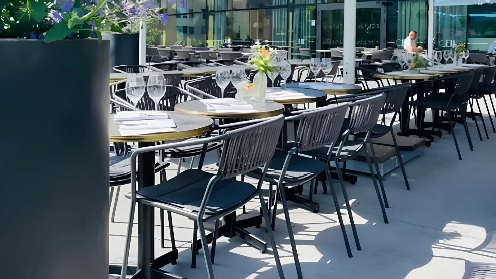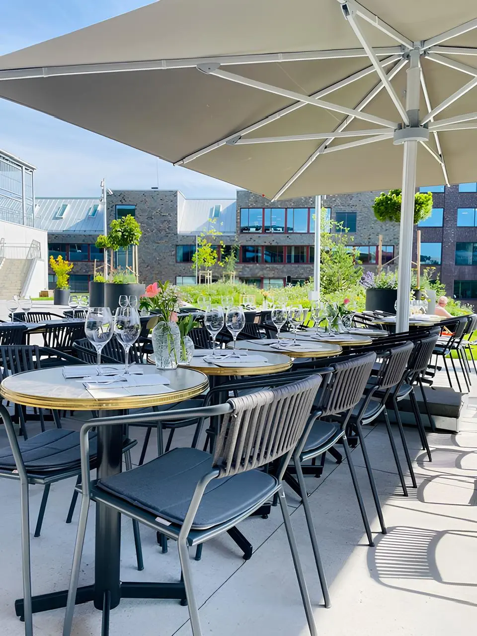 I World of Volvos spektakulära byggnad finns Ceno Brasserie. Vi har tagit fram förslag och levererat stolar och bord till uteservering samt bordsstativ till brasseriet och Ceno on top.